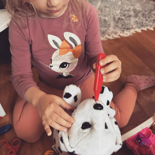 Póki co ulecza wszelkie pluszaki, a ja jako asystentka doklejam oczy, zaszywam rozprute ogonki czy łapki.