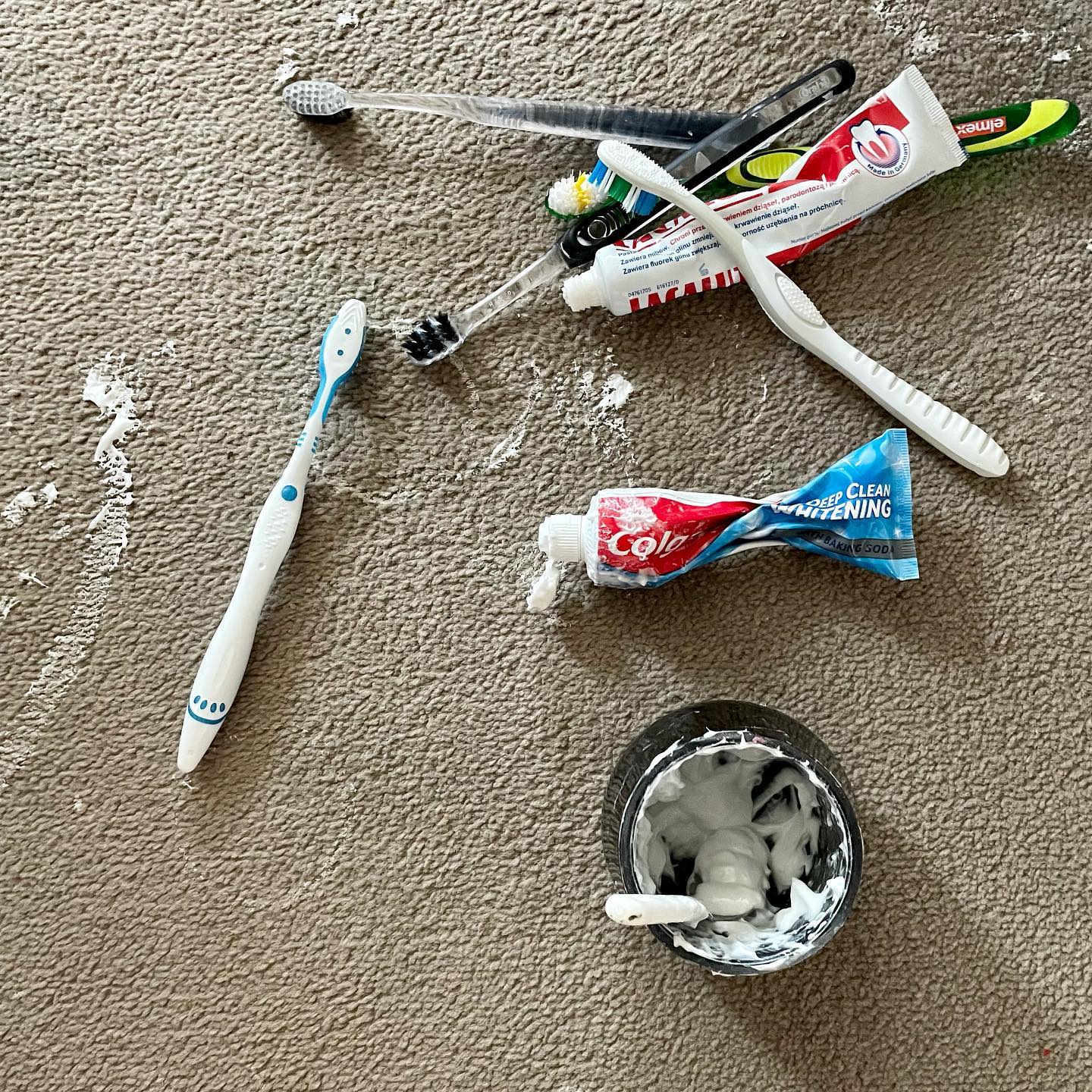 Myślisz, że limit na jeden dzień wyczerpany. Nic bardziej mylnego! Idziesz po pranie, a tam w holu czeka na Ciebie domowa maseczka…od @colgate? Tylko na co? Pytam, a Tulinka wzrusza ramionami i słyszę tylko słowo "Pasta, pasta Mama, zęby myju, myju". Piękna mozaika po całej powierzchni. Już wiem, że jedna z córek zamieszka kiedyś w tropikach, bo gacie jej zbędne, a druga chodząc ciągle ze szczoteczkami zajmie się higieną w innych dziobach. Taki oto TYLKO poranek.
