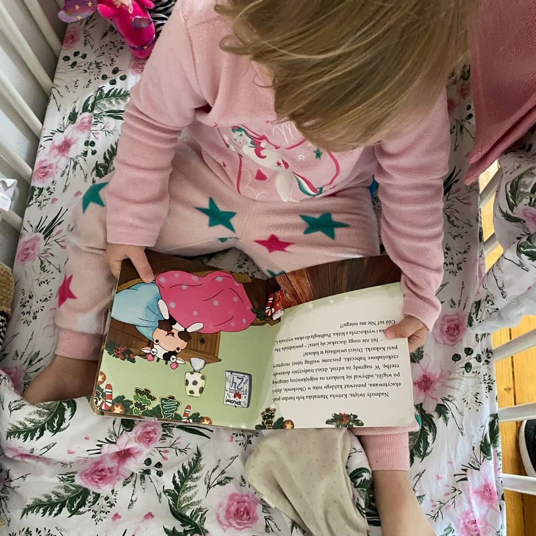 Często zdarza mi się zastać taki widok rano w tulinkowym zagajniku. Najczęściej z książką, no! Ostatnio z zabawkowym pianinkiem – dziękujemy Dziadkowie. Ważna jest książka, a że o Świętym Mikołaju czytam w marcu? A kto zabroni? W końcu zamiłowanie do książek wyssane z kurzym mlekiem 🥰