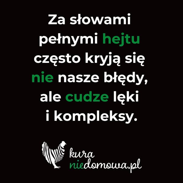 Kiedy ktoś obrzuca Cię bezpośrednio, albo za Twoimi plecami epitetami, oskarża o fałszywość czy inne rzekome winy, pamiętaj, że często to nie Ty jesteś problemem, ale to, czego nie potrafi zaakceptować osoba, która Cię atakuje. Hejt nie jest wynikiem Twoich działań, a raczej niezaadresowanych kompleksów i lęków tych, którzy czują się zagrożeni Twoją autentycznością. Często takie osoby nie potrafią poradzić sobie ze swoimi porażkami, więc szukają ofiar, by przerzucić na nie swoje frustracje. Osoba, która krytykuje, obraża czy szuka winy w innych, często zmaga się z własnym poczuciem porażki lub brakiem uznania. To sposób, by odwrócić uwagę od siebie i swoich trudności. Jestem tu, by przypomnieć Ci, że nie musisz nosić winy za cudze nierozwiązane problemy. Twoja wartość nie zależy od słów innych bo to, co słyszysz od innych, nie zawsze mówi o Tobie. To mówi o nich.