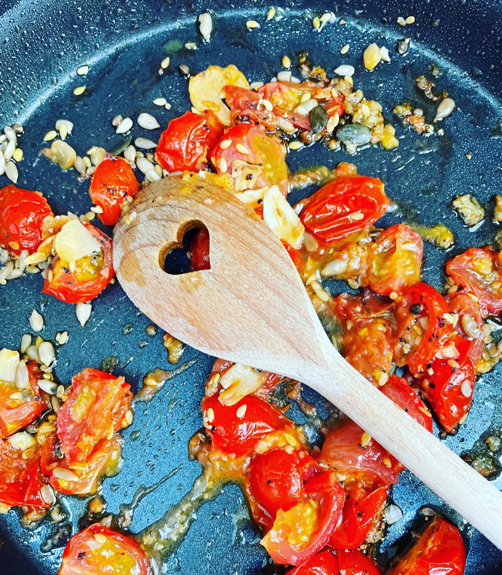 Makaron ryżowy z pomidorkami koktajlowymi, bazylią, czosnkiem, tuńczykiem i zielonym pesto.